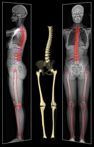 L'une des caractéristiques les plus remarquables de la cabine EOS est sa capacité à produire des images tridimensionnelles du squelette de haute qualité, en position debout. Cette visualisation avancée permet aux médecins d'analyser avec précision les structures osseuses et les articulations et leurs différents angles, offrant ainsi une compréhension plus complète des morphologies osseuses et des anomalies anatomiques.